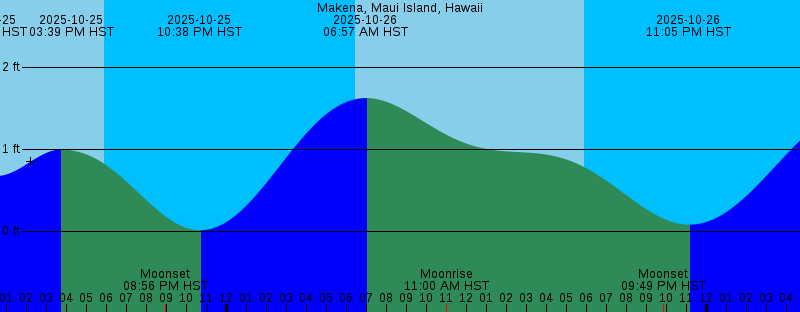 2025-10-25 06:05 AM HST 1.73 feet High Tide 2025-10-25 06:25 AM HST Sunrise 2025-10-25 10:08 AM HST Moonrise 2025-10-25 12:30 PM HST 0.68 feet Low Tide 2025-10-25 03:39 PM HST 1.00 feet High Tide 2025-10-25 05:54 PM HST Sunset 2025-10-25 08:56 PM HST Moonset 2025-10-25 10:38 PM HST 0.01 feet Low Tide 2025-10-26 06:25 AM HST Sunrise 2025-10-26 06:57 AM HST 1.62 feet High Tide 2025-10-26 11:00 AM HST Moonrise 2025-10-26 05:53 PM HST Sunset 2025-10-26 09:49 PM HST Moonset 2025-10-26 11:05 PM HST 0.08 feet Low Tide 2025-10-27 06:26 AM HST Sunrise 2025-10-27 08:10 AM HST 1.54 feet High Tide 2025-10-27 11:50 AM HST Moonrise 2025-10-27 05:52 PM HST Sunset 2025-10-27 10:44 PM HST Moonset 2025-10-27 11:40 PM HST 0.17 feet Low Tide 2025-10-28 06:26 AM HST Sunrise 2025-10-28 09:45 AM HST 1.53 feet High Tide 2025-10-28 12:36 PM HST Moonrise 2025-10-28 05:52 PM HST Sunset 2025-10-28 11:41 PM HST Moonset 2025-10-29 12:41 AM HST 0.28 feet Low Tide |