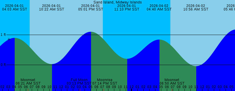 2026-04-01 04:04 AM SST 0.90 feet High Tide 2026-04-01 06:21 AM SST Moonset 2026-04-01 06:39 AM SST Sunrise 2026-04-01 10:22 AM SST 0.03 feet Low Tide 2026-04-01 03:13 PM SST Full Moon 2026-04-01 05:01 PM SST 1.10 feet High Tide 2026-04-01 07:07 PM SST Sunset 2026-04-01 07:14 PM SST Moonrise 2026-04-01 11:10 PM SST 0.20 feet Low Tide 2026-04-02 04:40 AM SST 0.84 feet High Tide 2026-04-02 06:38 AM SST Sunrise 2026-04-02 06:50 AM SST Moonset 2026-04-02 10:56 AM SST -0.04 feet Low Tide 2026-04-02 05:46 PM SST 1.18 feet High Tide 2026-04-02 07:08 PM SST Sunset 2026-04-02 08:10 PM SST Moonrise 2026-04-03 12:00 AM SST 0.22 feet Low Tide 2026-04-03 05:15 AM SST 0.79 feet High Tide 2026-04-03 06:36 AM SST Sunrise 2026-04-03 07:21 AM SST Moonset 2026-04-03 11:27 AM SST -0.09 feet Low Tide 2026-04-03 06:27 PM SST 1.22 feet High Tide 2026-04-03 07:08 PM SST Sunset 2026-04-03 09:07 PM SST Moonrise 2026-04-04 12:45 AM SST 0.24 feet Low Tide 2026-04-04 05:47 AM SST 0.74 feet High Tide 2026-04-04 06:35 AM SST Sunrise 2026-04-04 07:55 AM SST Moonset 2026-04-04 11:59 AM SST -0.13 feet Low Tide 2026-04-04 07:07 PM SST 1.24 feet High Tide 2026-04-04 07:09 PM SST Sunset 2026-04-04 10:04 PM SST Moonrise 2026-04-05 01:27 AM SST 0.27 feet Low Tide |